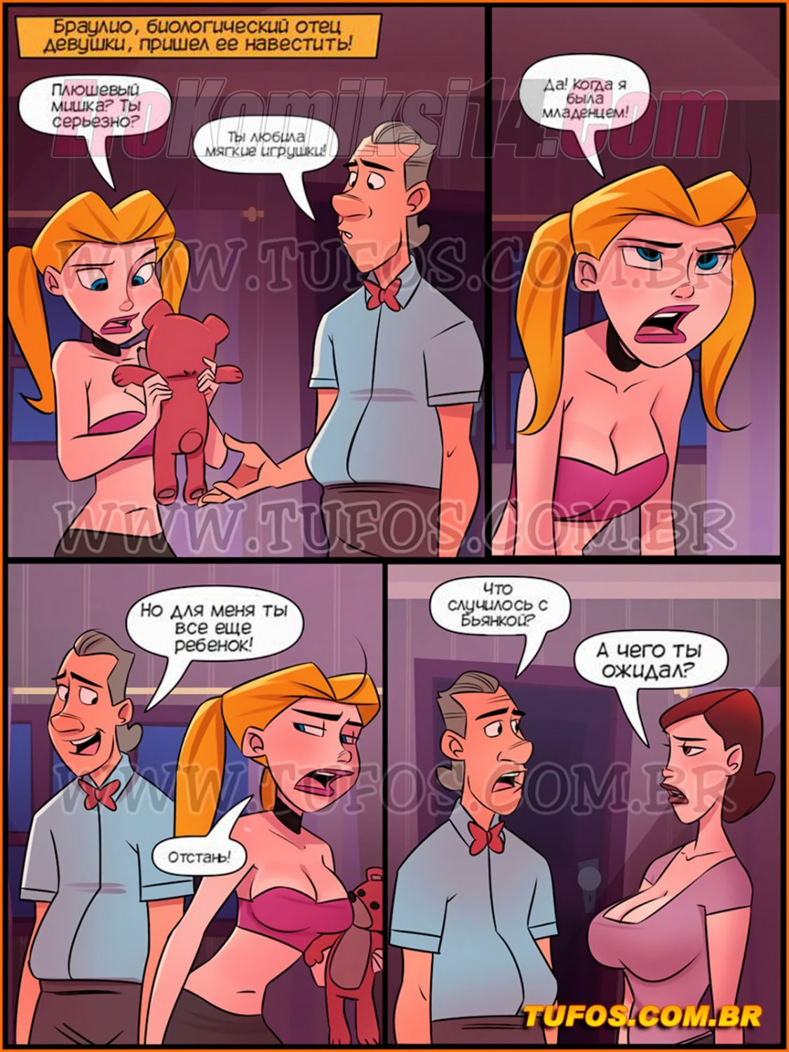 Порно комикс Семья Распутос. Часть 14. Отцы. К девушке пришел навестить биологический отец, но нынешний отец против этого, и между нами образовалась соперничество, чтобы это прекратить девушка разделась и, в общем обо всем узнаете далее…
