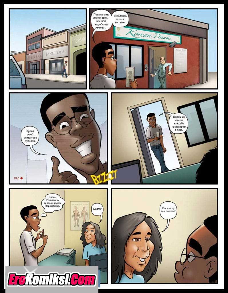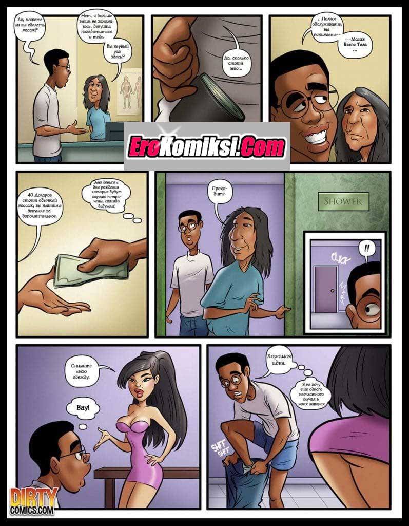 Порно комикс Счастливый конец. Чернокожий парень пошёл на массаж к азиатской девушке. Она разделась до гола и начала массировать его своим сексуальным телом