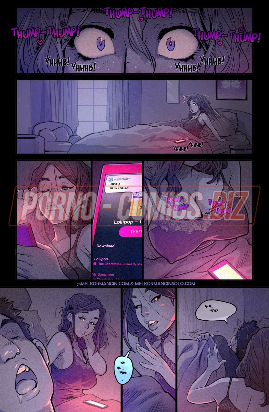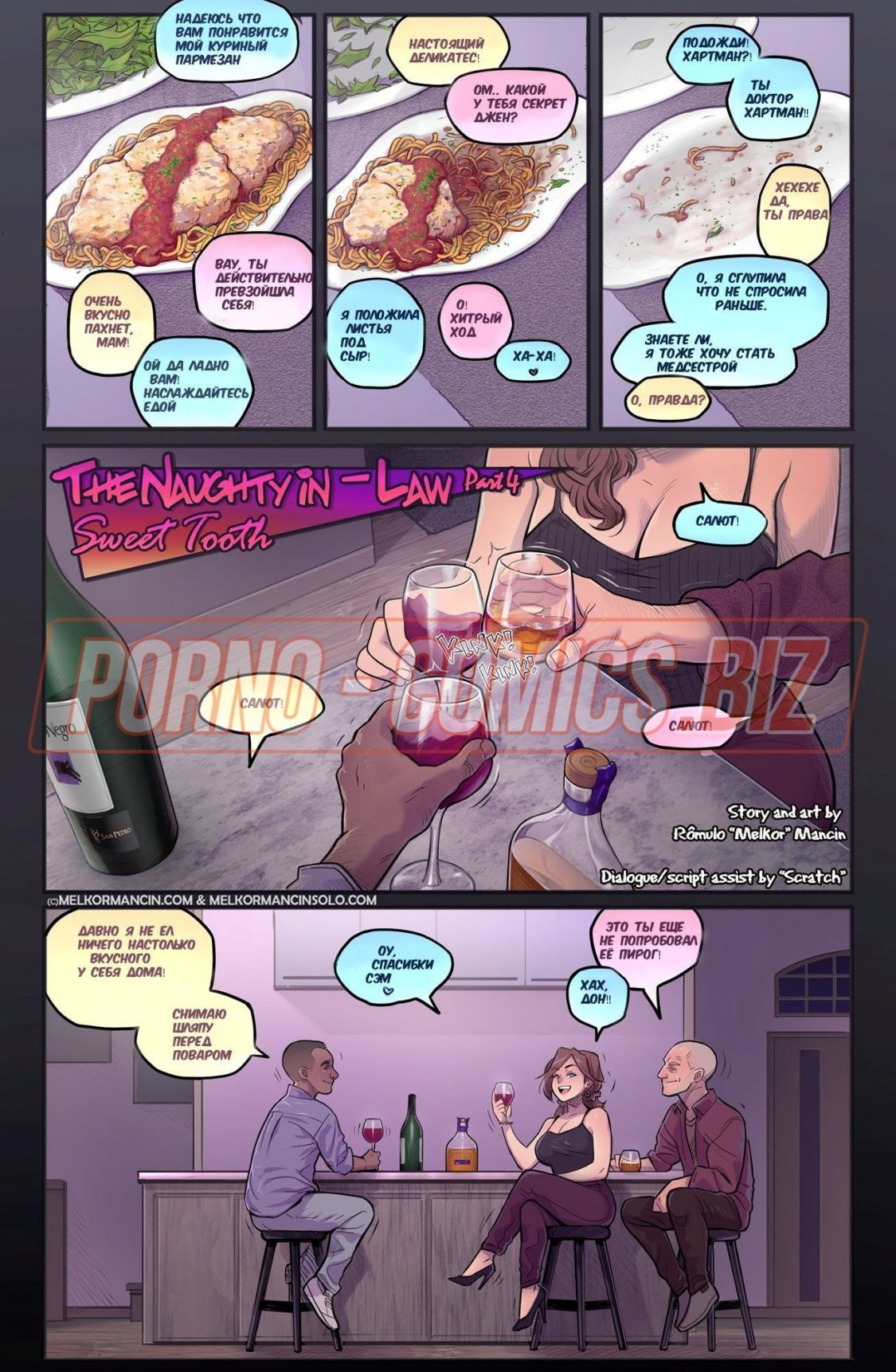 Пышногрудая героиня порно комикса "Сладкоежка" так любит что-то сладкое и вкусное, что даже посреди ночи лижет конфеты, а потом пихает их себе в пилотку или в анал. Проснувшись снова посреди ночи, сладкоежка знакомится с отцом своего мужа. Когда тот предлагает пойти в бар, сучка смело соглашается. Сначала невестка держит дистанцию с ним, а потом отдается эмоциям и охотно занимается страстным сексом.