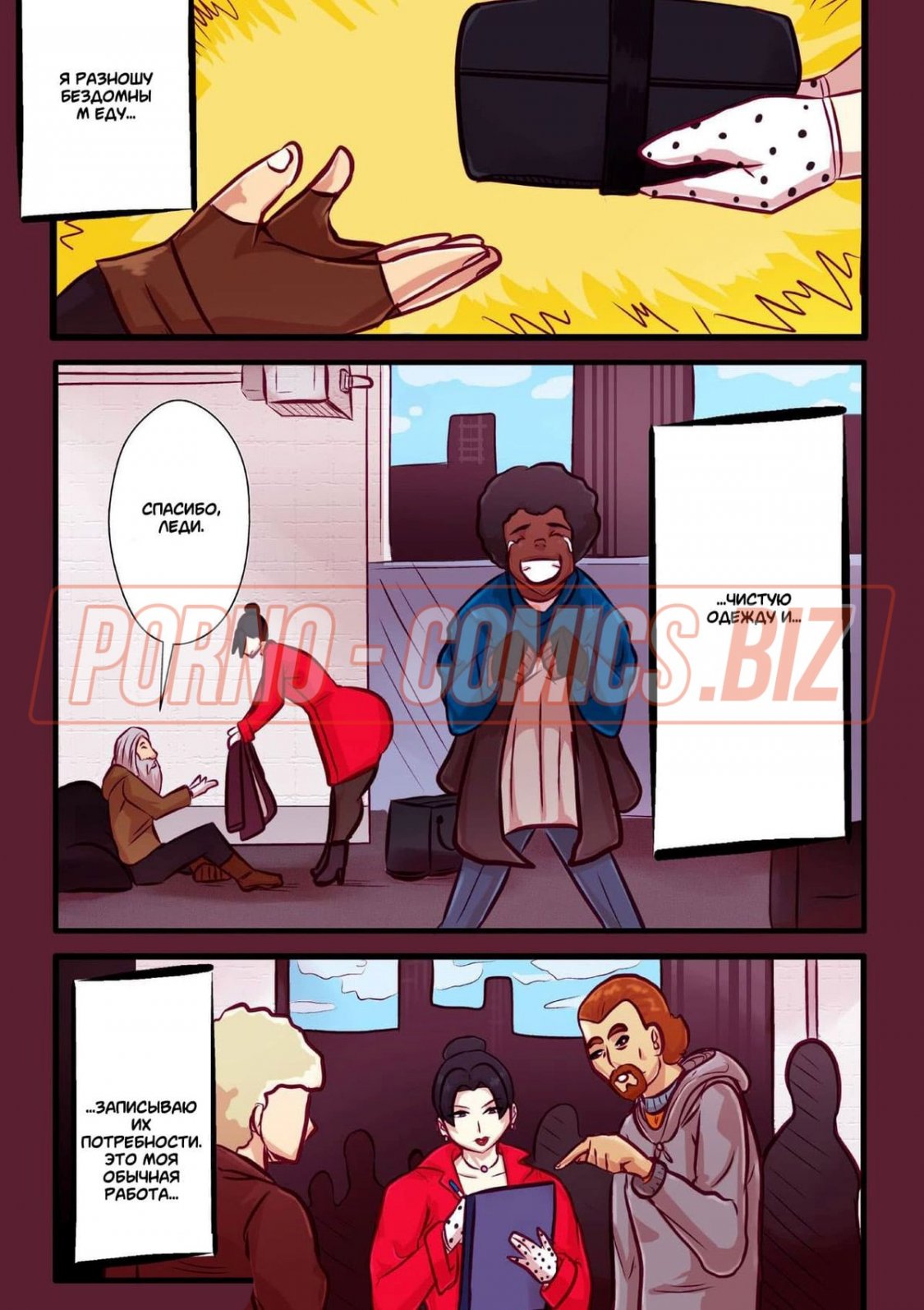 Замужняя милфа соблазняет бедняка которому оказала помощь в секс комиксе «Страстные мамашки»